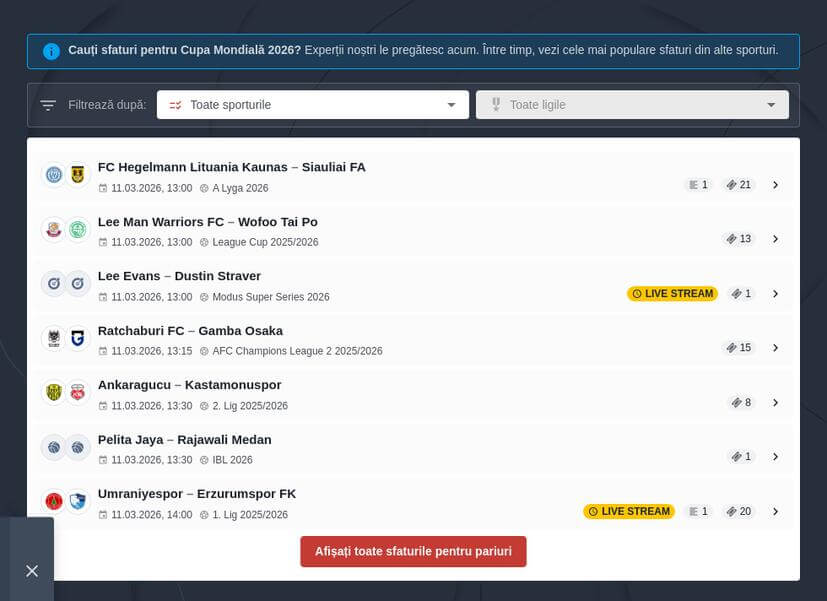 Pe lângă materialele dedicate Cupei Mondiale 2026, te poți pregăti pentru predicții comparând propriile tale ponturi cu cele ale pariorilor din întreaga lume. Află mai multe despre concursul nostru - Liga Tipsterilor: analizează, pariază și, poate, câștigă premii deosebite!