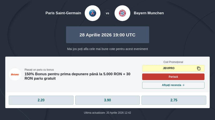 Cele mai competitive cote pentru meciul PSG vs Bayern Munich le găsești la Betano. Această casă de pariuri oferă în mod constant cote peste medie pentru pariurile pe Liga Campionilor, iar pentru această confruntare, cotele sunt deosebit de atractive.